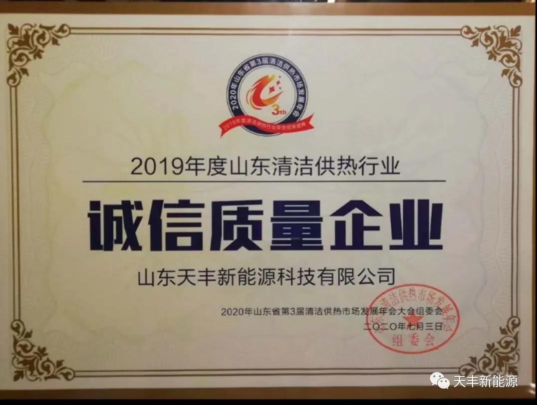 7月3日,山東省第3屆清潔供熱市場發(fā)展年會在濟南召開,山東天豐新能源科技有限公司受邀參加本次會議,在大會版塊“2019年度清潔供熱行業(yè)榮譽授牌儀式”上,天豐新能源斬獲“誠信質量企業(yè)”榮譽授牌,再一次佐證天豐產品質量與品牌信譽的良好口碑。