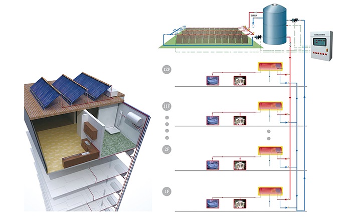 室外(屋面、空地等)安裝大面積的太陽(yáng)能集熱器矩陣吸收太陽(yáng)能量,并將光能轉(zhuǎn)化成熱能后儲(chǔ)存在室內(nèi)每戶(hù)設(shè)置的儲(chǔ)熱水箱內(nèi),通過(guò)戶(hù)內(nèi)儲(chǔ)熱水箱分散供水的系統(tǒng)。